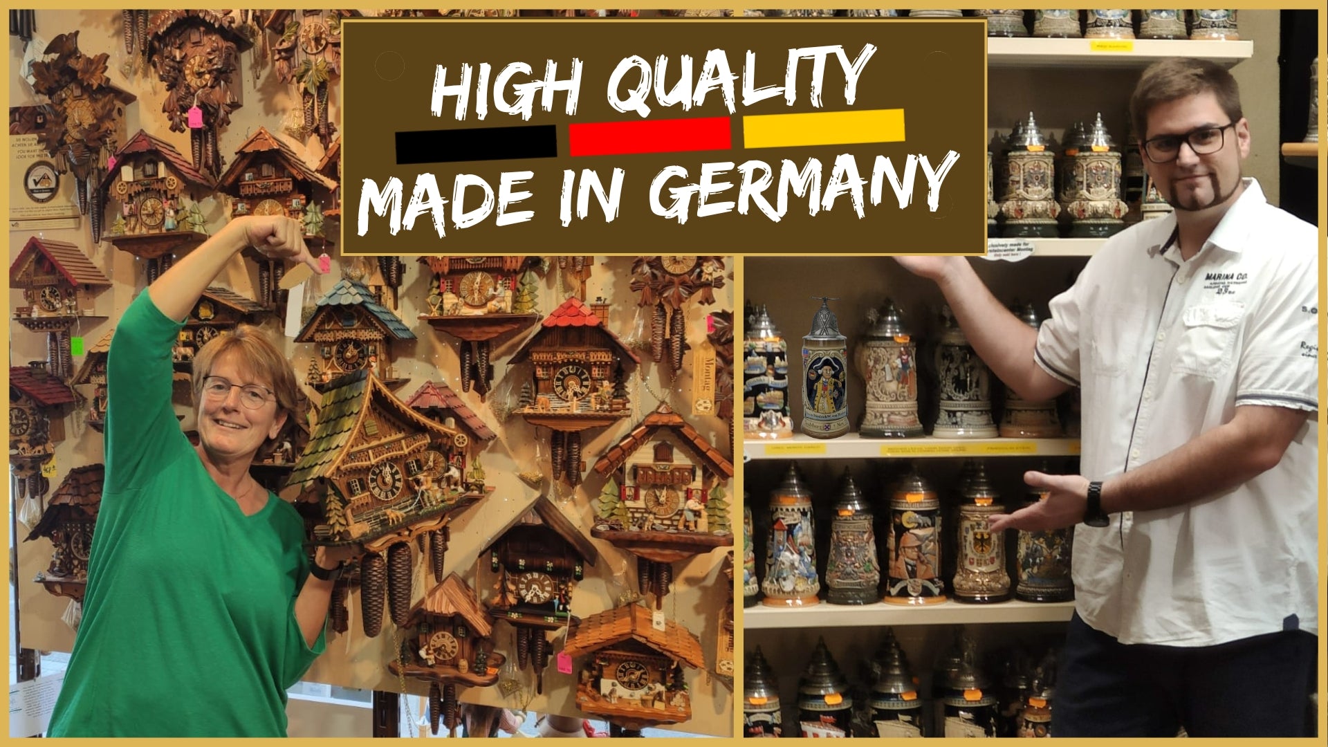 Our cuckoo clocks and beer mugs are handmade. Production takes place exclusively in Germany. Our cuckoo clocks are made from Black Forest wood. All our steins are painted by hand.